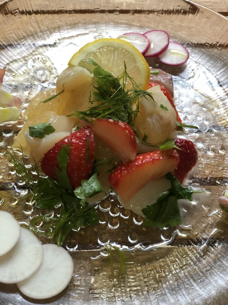 こちらの写真は少し前に作ったサラダです。イチゴとグレープフルーツ、そして鯛のお刺身。ドレッシングでさっと和えました。フルーツってサラダにも使えるんですよね。
